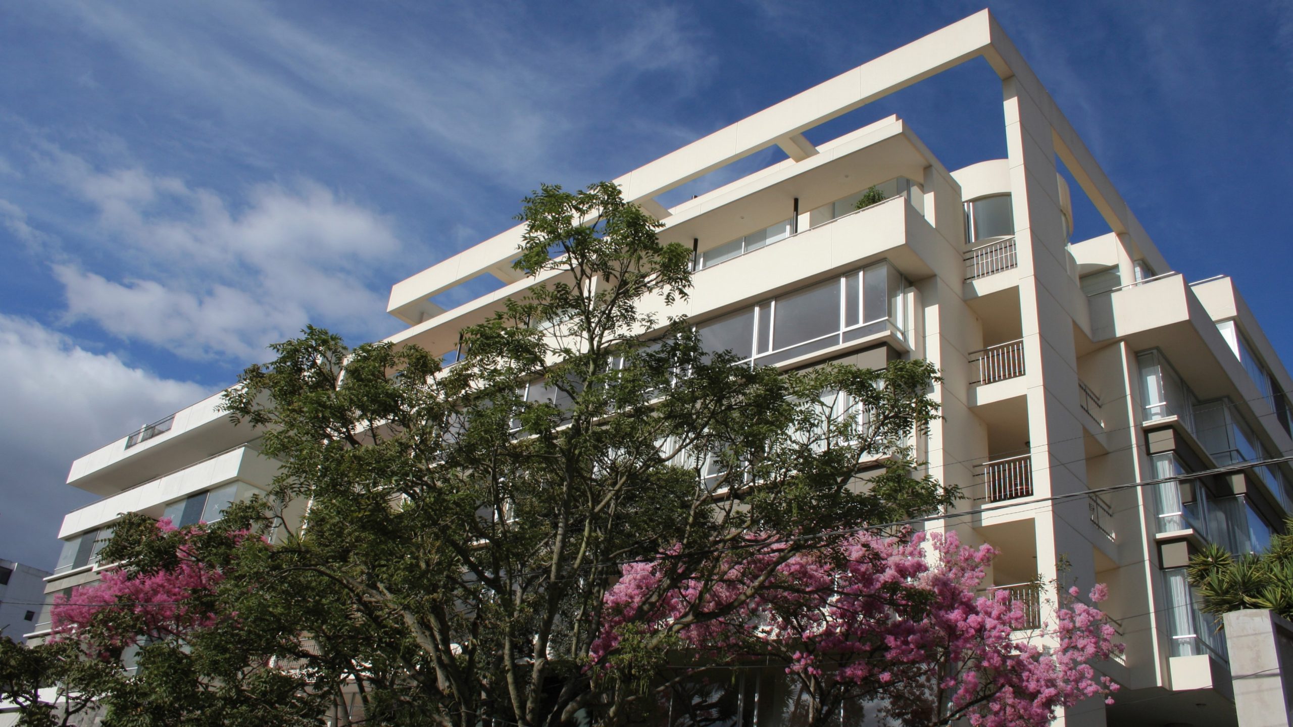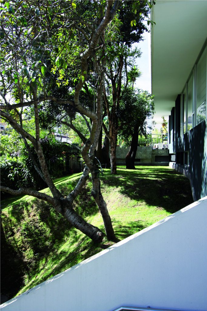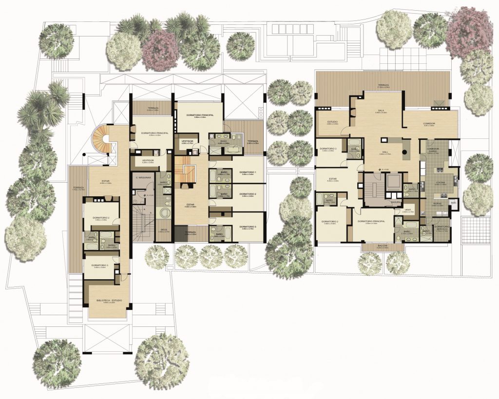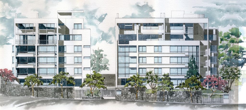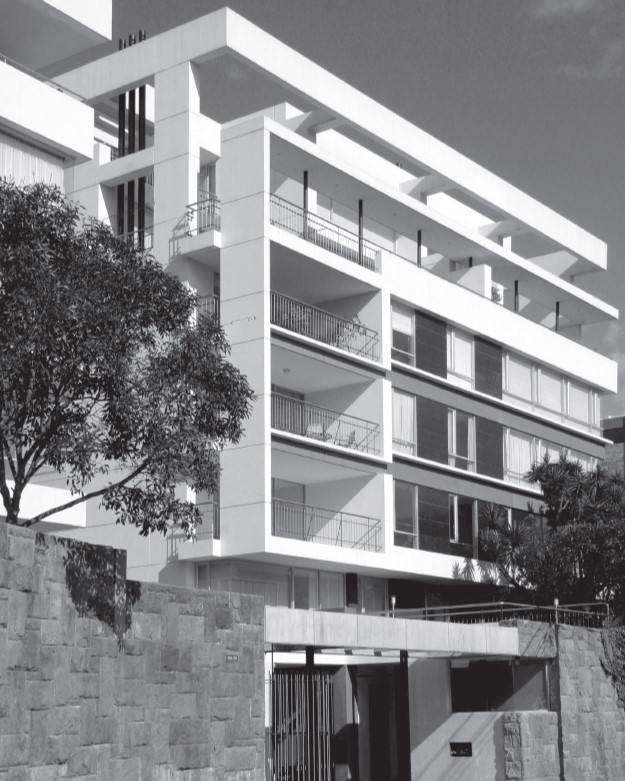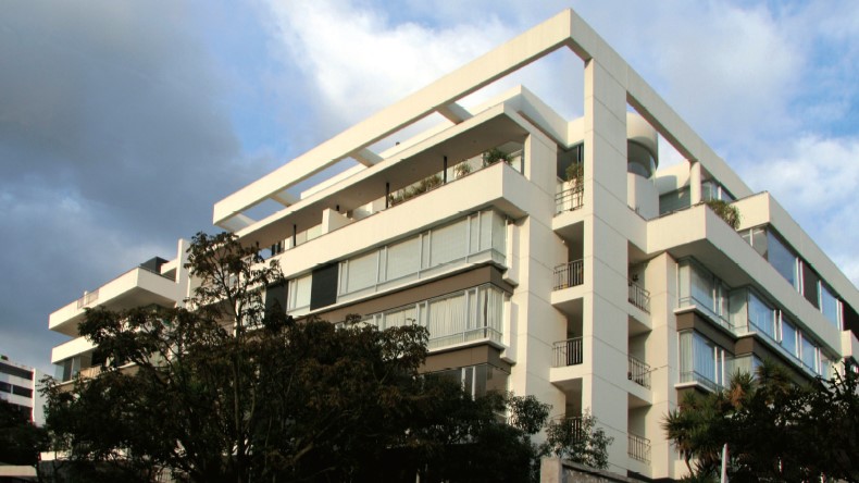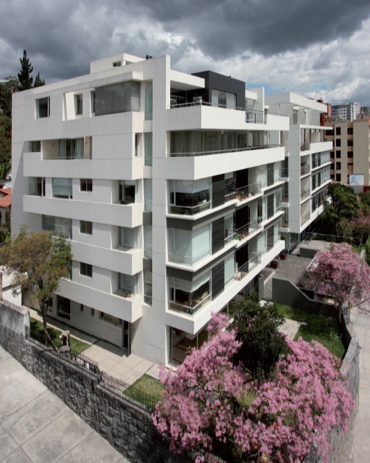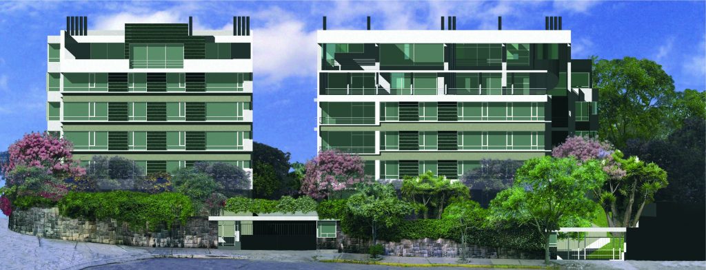 Dos torres de 6 pisos con apartamentos simplex y dúplex, muchos con terrazas y chimeneas. Las fachadas frontal y lateral se caracterizan por unas proyecciones volumétricas compuestas de bandas horizontales en cristal y acentuadas por planos en granito negro; los principales ambientes sociales y comunales se relacionan con los jardines y arborización conservada.