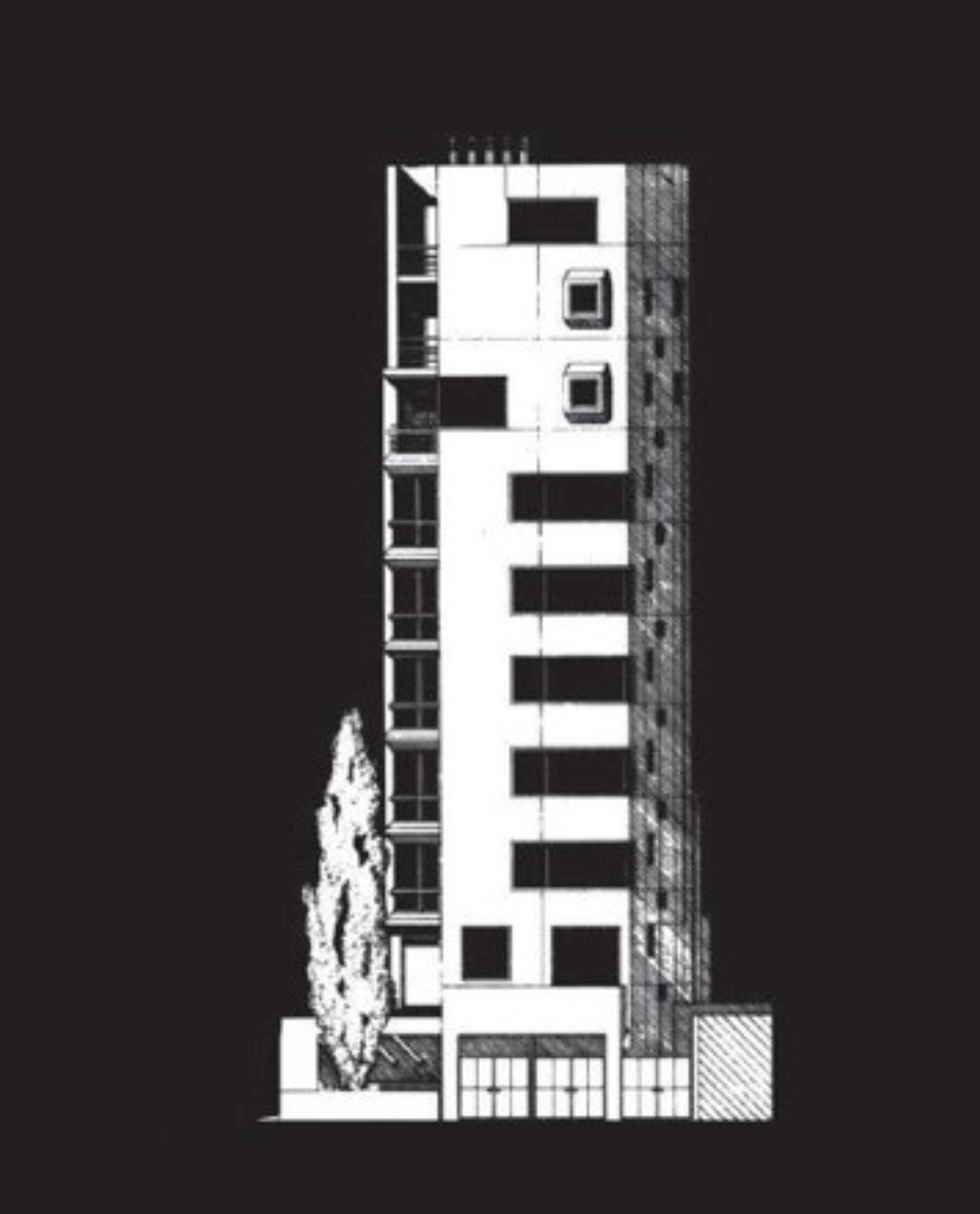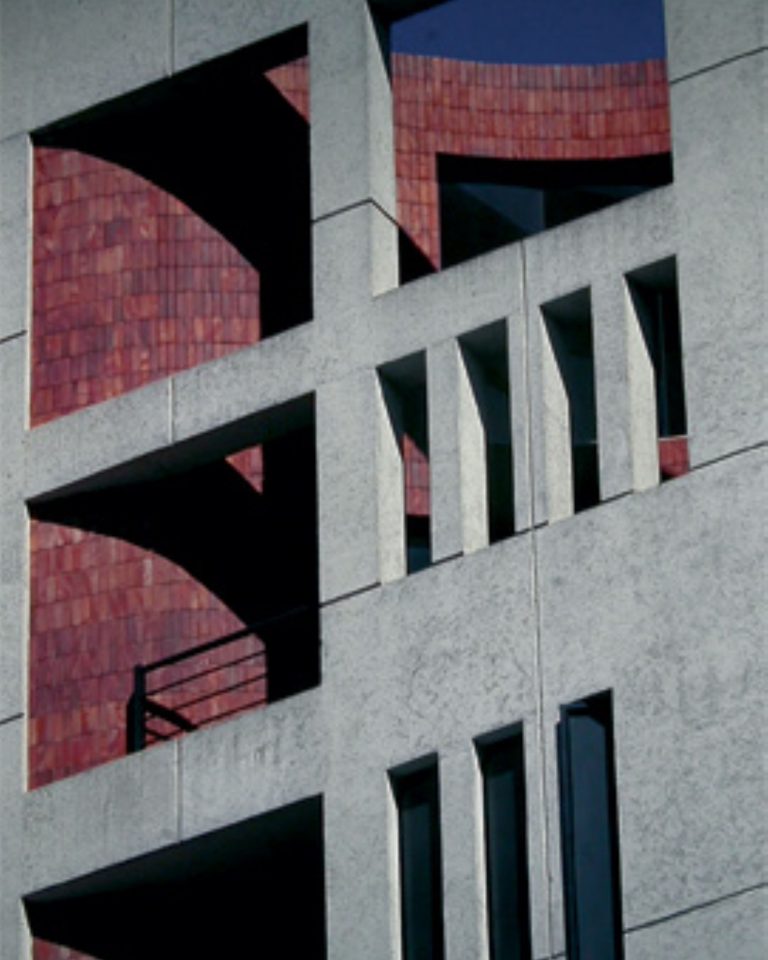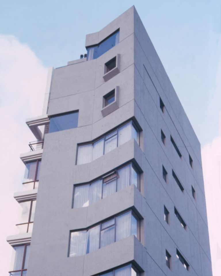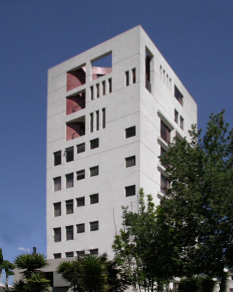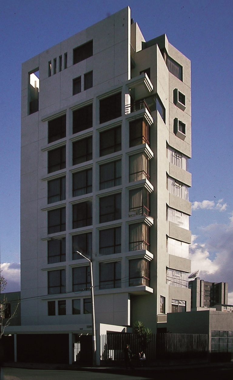Un terreno urbanamente atípico con tres frentes y una respuesta arquitectónica que enfatiza la base y el remate del edificio con desplazamientos volumétricos y soluciones dúplex. Un cuerpo intermedio que se proyecta a través de una trama reconociendo la presencia del parque y las montañas.