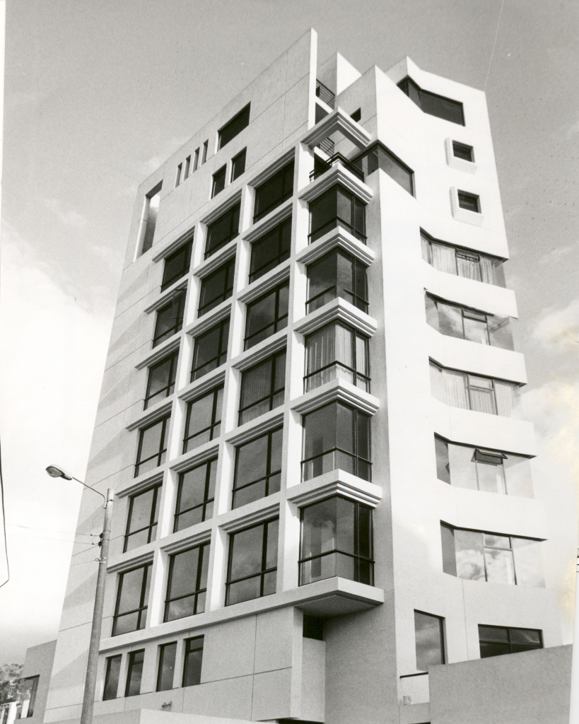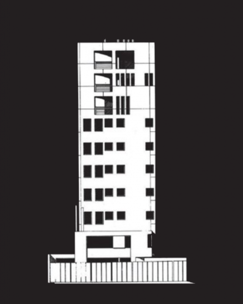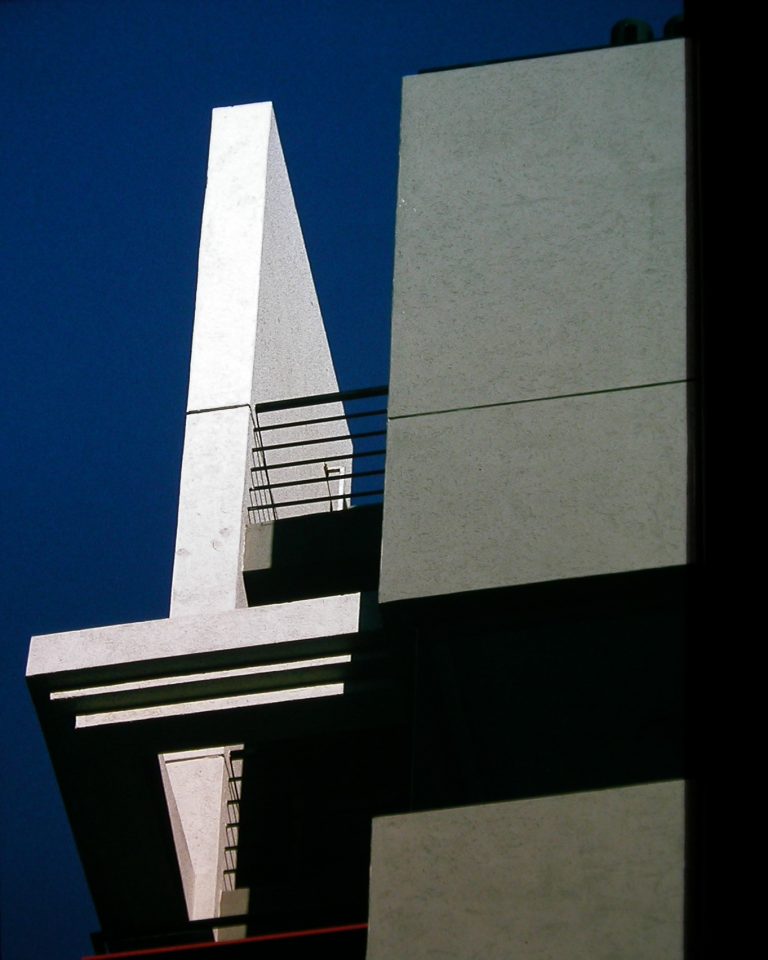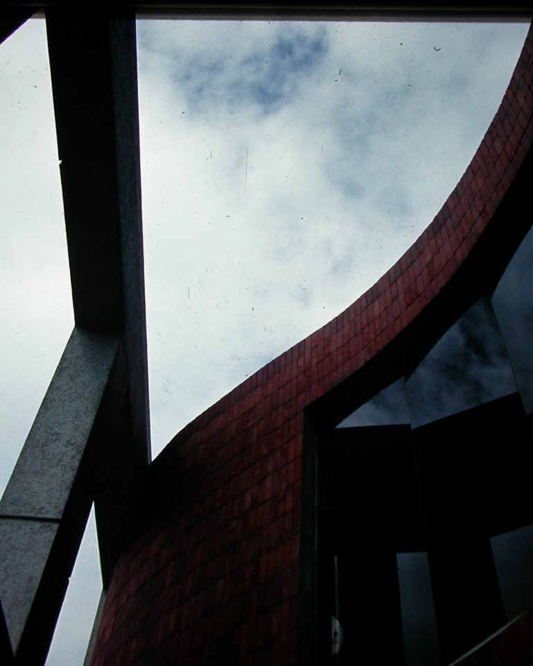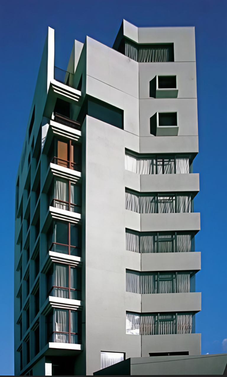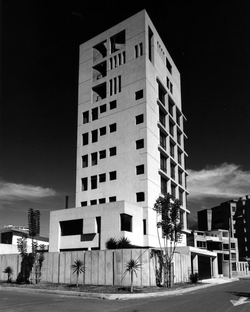 Un terreno urbanamente atípico con tres frentes y una respuesta arquitectónica que enfatiza la base y el remate del edificio con desplazamientos volumétricos y soluciones dúplex. Un cuerpo intermedio que se proyecta a través de una trama reconociendo la presencia del parque y las montañas.