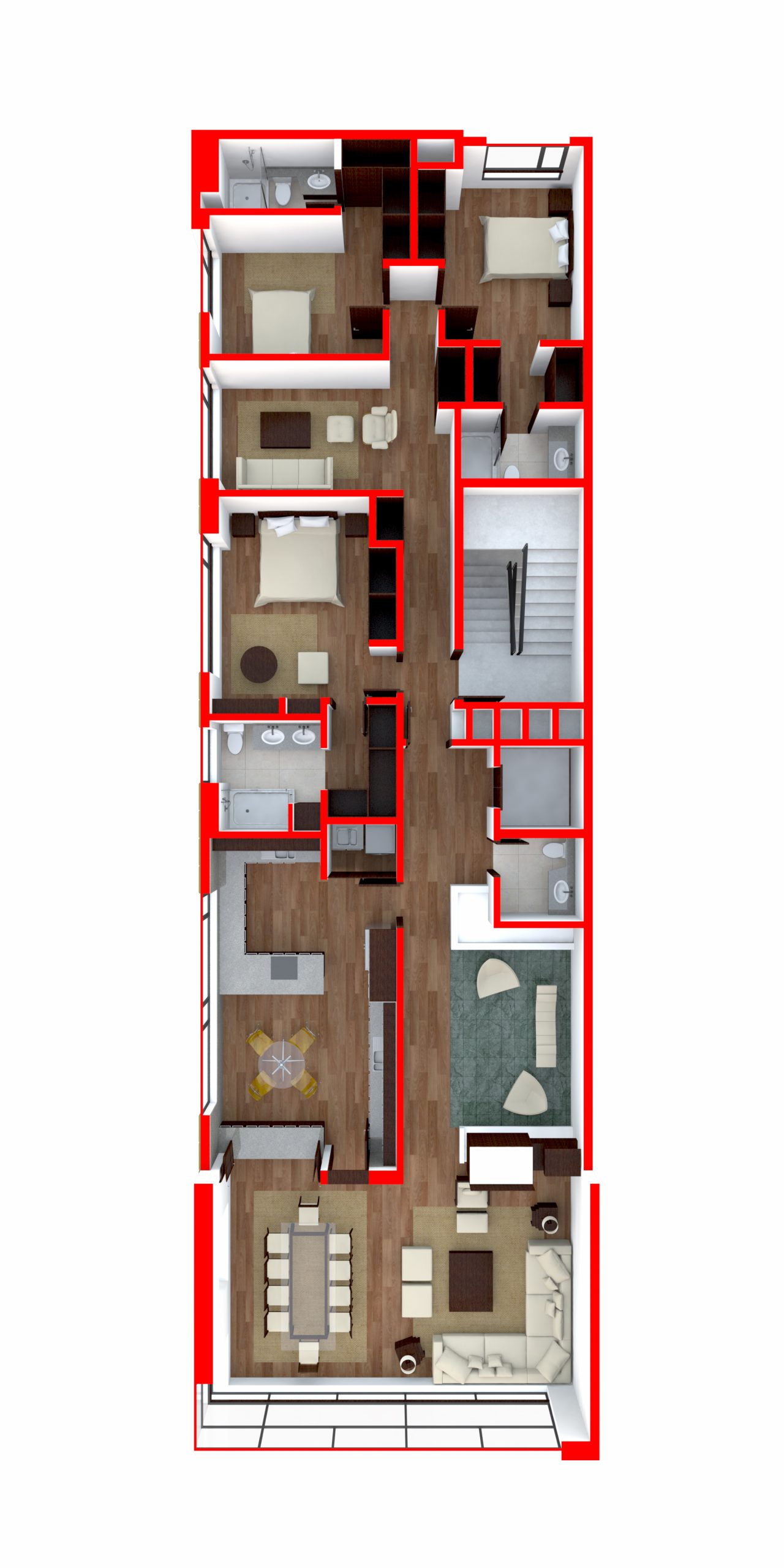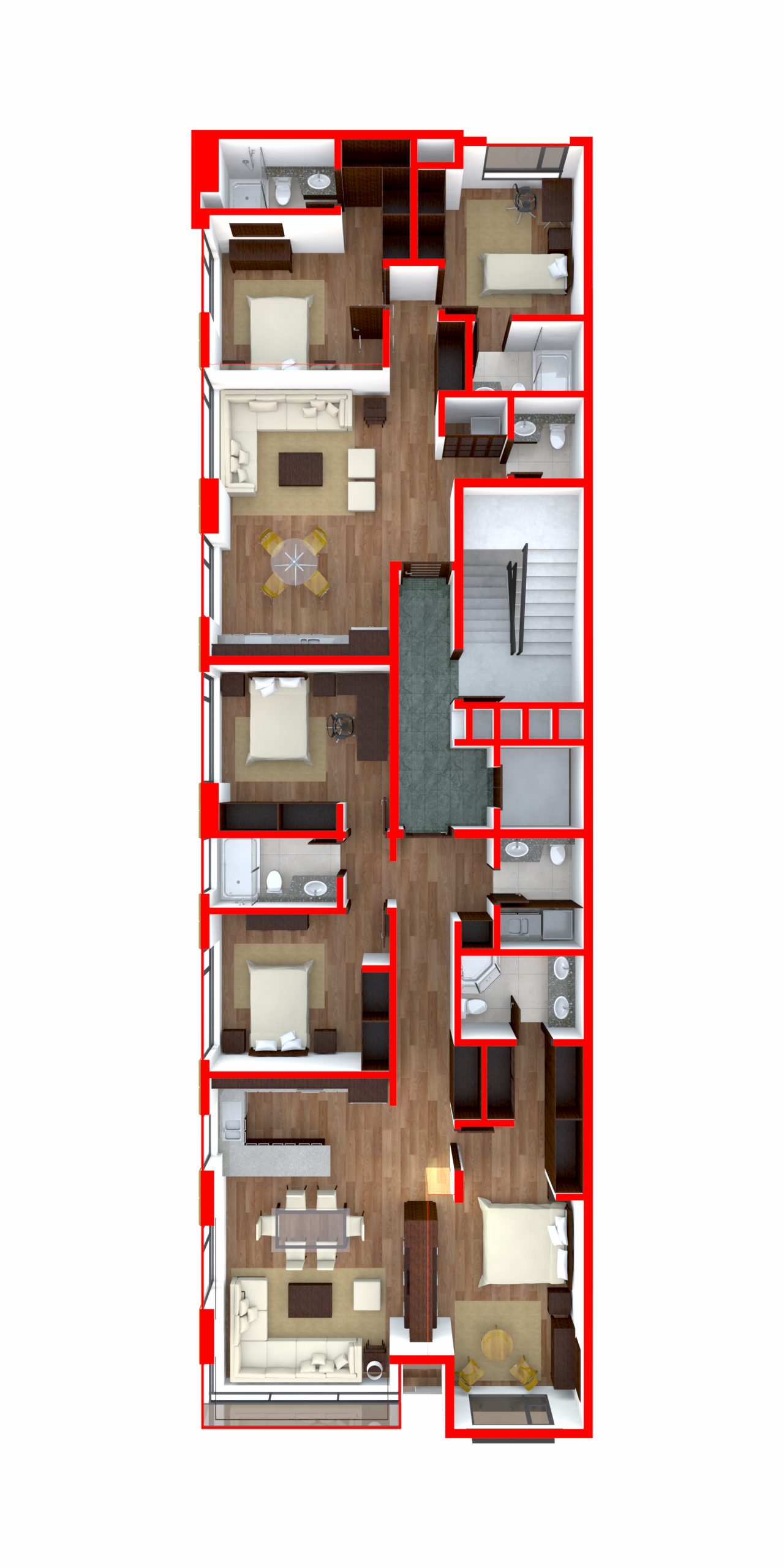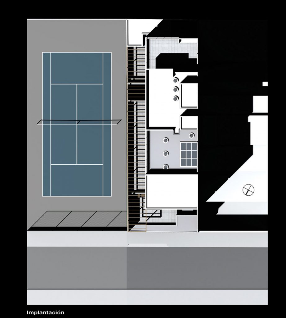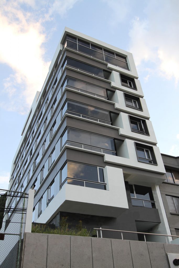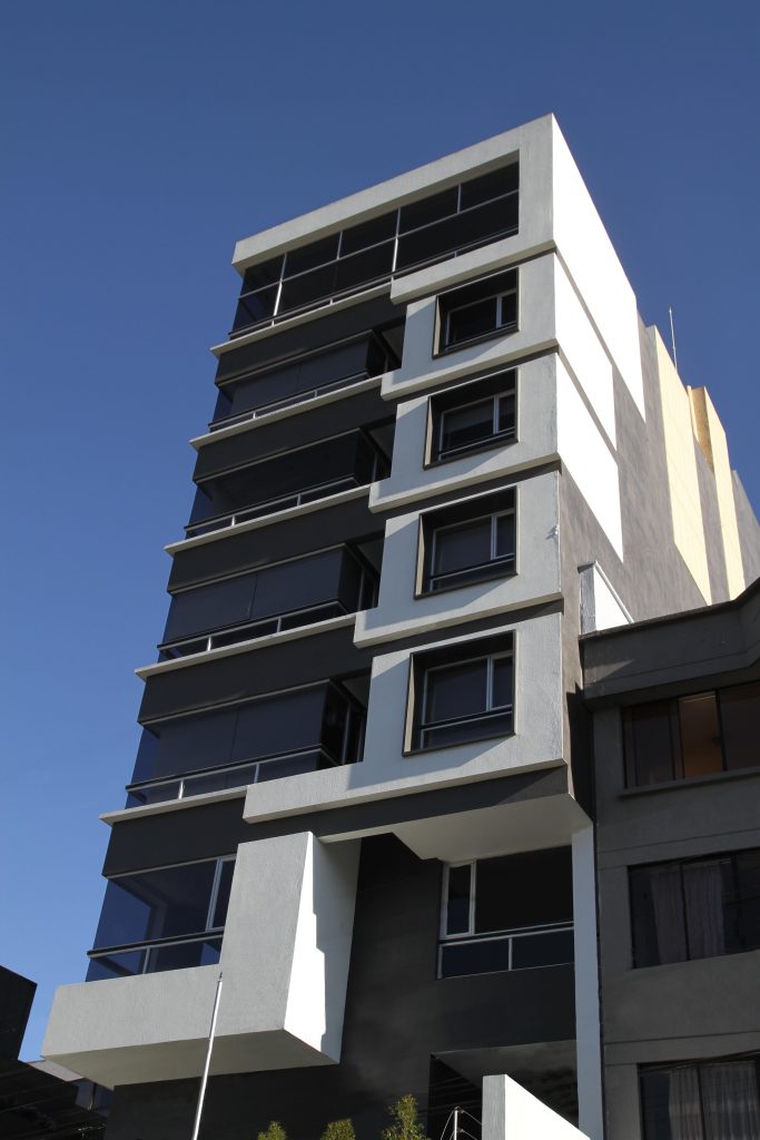 Una torre de 8 pisos con apartamentos. Tiene una de sus caras adosadas y la otra se abre hacia un espacio deportivo. Las fachadas se resuelven con franjas horizontales que marcan los niveles y buscan la vista. La torre remata en un área común con salón y espacios para BBQ y reuniones.