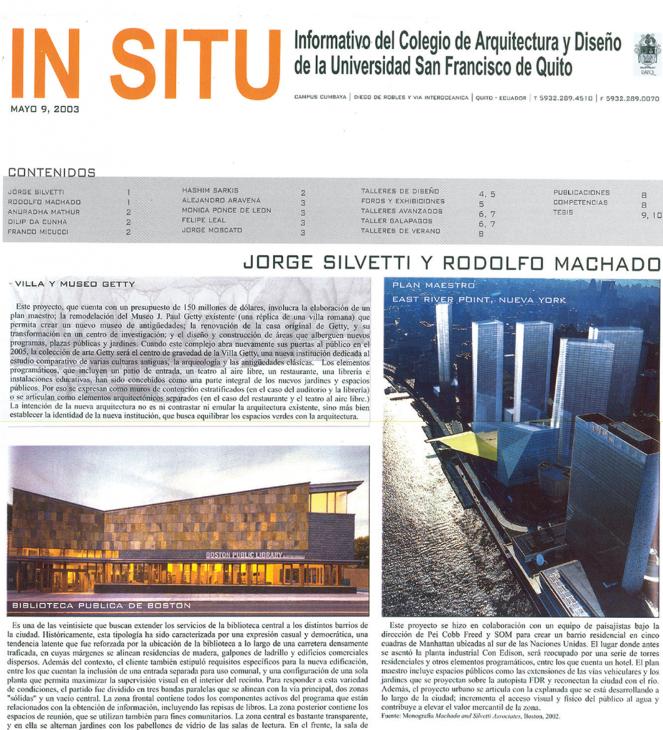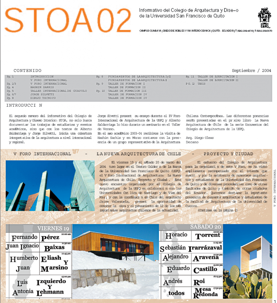 El Proyecto Editorial al inicio fue concebido para documentar los Foros Internacionales de Arquitectura y que el excelente material de éstos estuviera disponible para el que lo requiera. Este objetivo inicial se mantiene pero las publicaciones se encuentran en plena expansión de objetivos y temas. “DQ/MANUS”, La Revista del Colegio, ha sacado 3 números temáticos y busca convertirse en una revista indexada. “IN SITU” y “STOA”, son una especie de periódico, lo ideal sería que está fuera administrada por los estudiantes; que sea el vehículo de expresión de ellos.