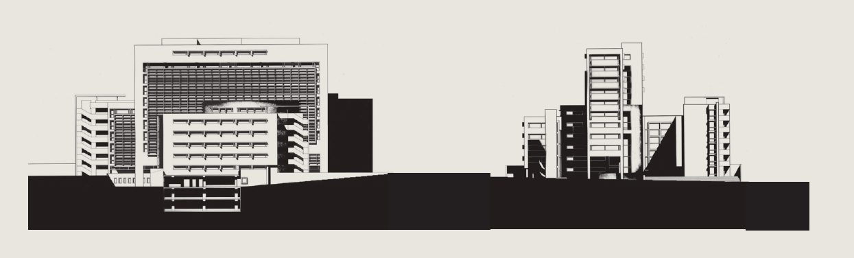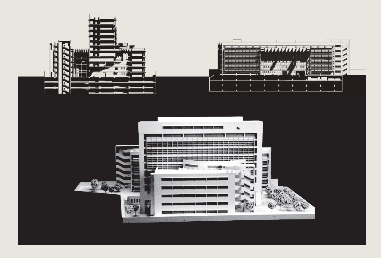 En un terreno medianero, los dos edificios institucionales se organizan a los costados de una galería de cuatro pisos de altura; ésta comunica dos espacios exteriores, una plazoleta de ingreso y un jardín contemplativo. Complementa la imagen institucional el tratamiento de fachada con quiebrasoles en hormigón visto.