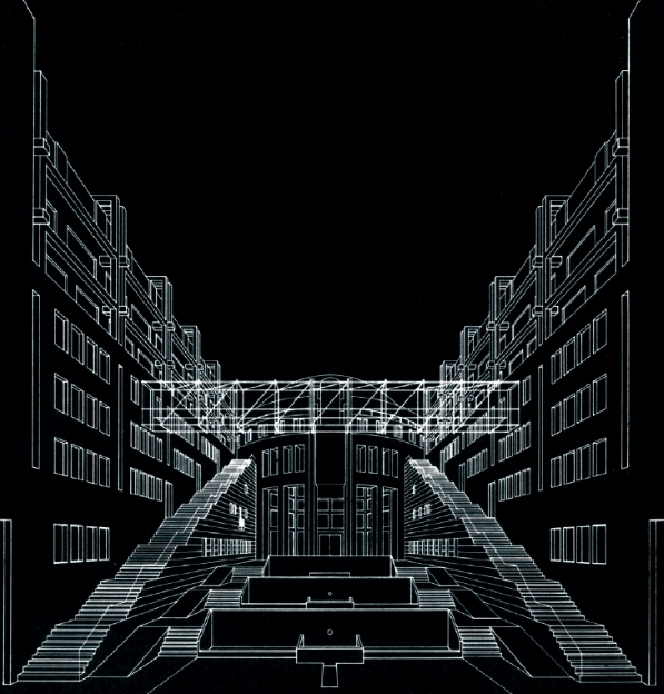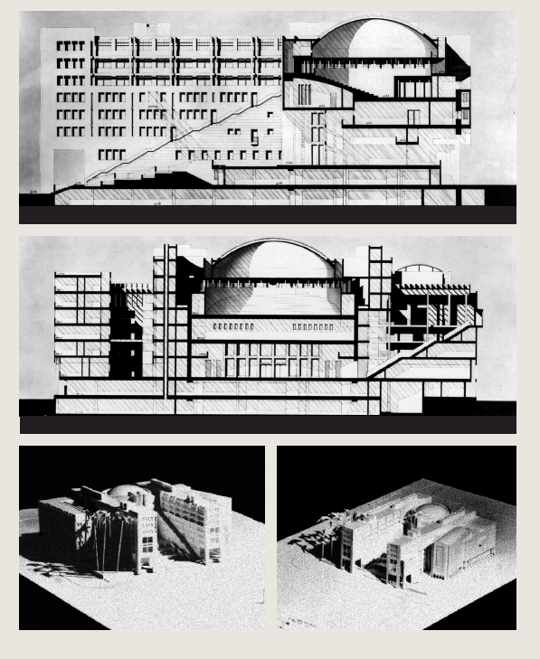 El proyecto de 18 000 m2 plantea una sala de audiencias, oficinas administrativas, espacios complementarios además de áreas públicas exteriores. Las oficinas del centro han sido dispuestas en dos barras. Éstas definen una plaza rectangular la cual remata en un cuerpo cilíndrico que contiene el hall de ingreso, y sobre éste se ubica la sala de audiencias, elemento en el cual la justicia se hace visible. El eje de la plazoleta se continúa con un Monumento a los Caídos en las luchas contra el crimen.